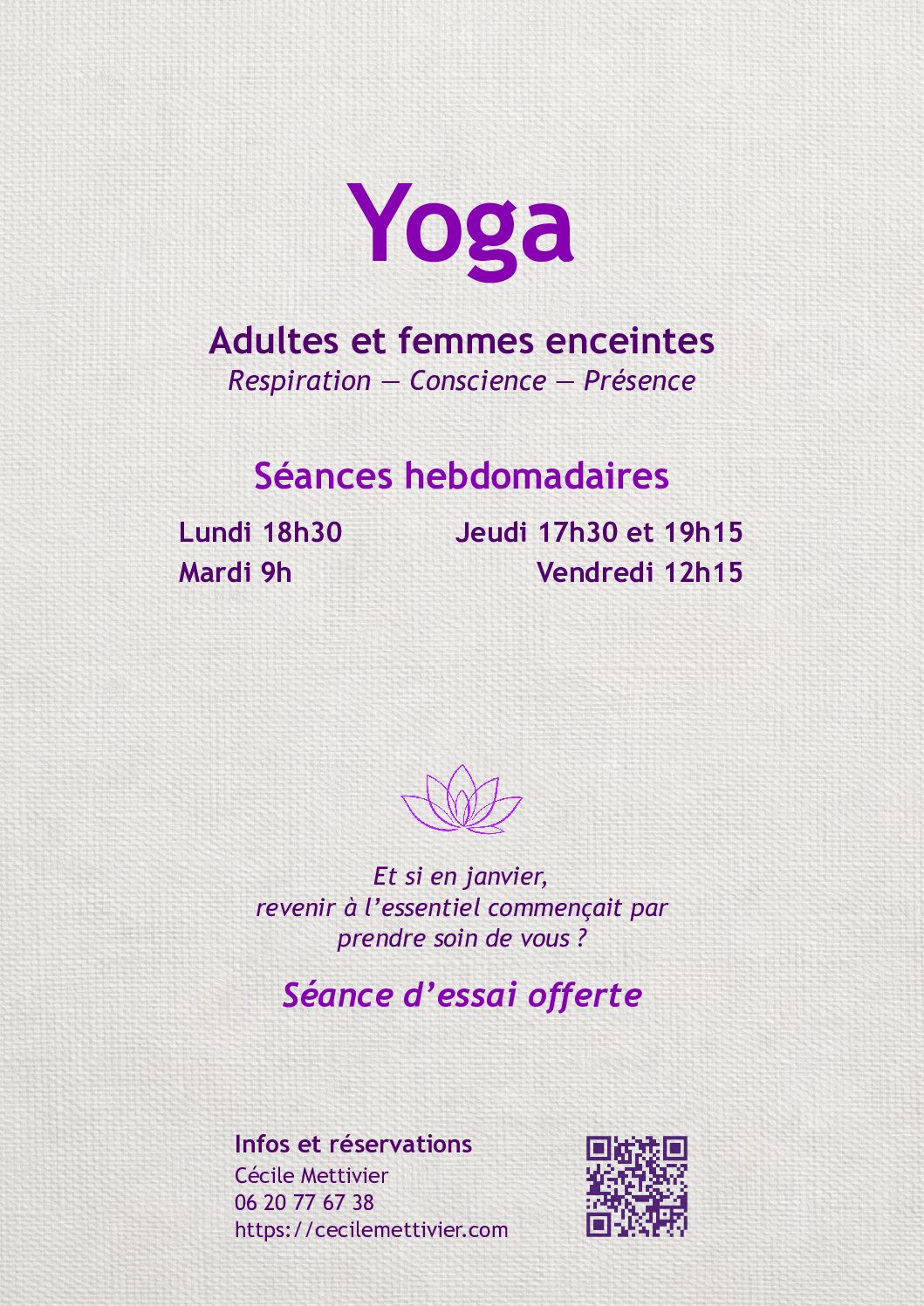 Cette affiche accompagne l’ouverture des séances hebdomadaires de yoga, proposées aux adultes et aux femmes enceintes.